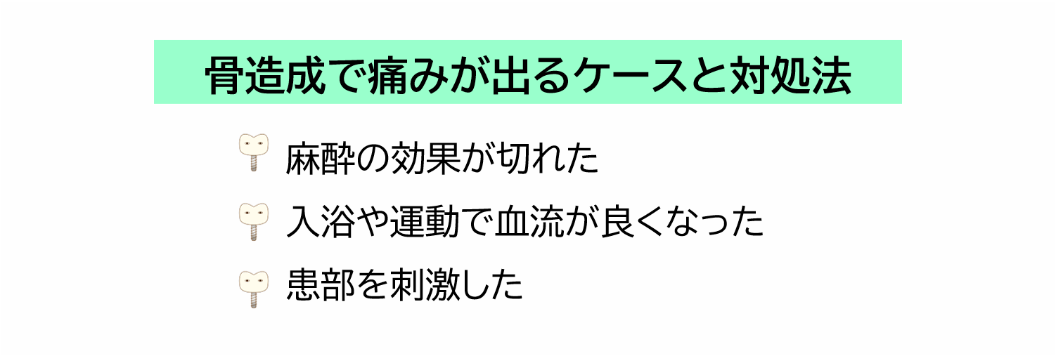 骨造成では、次に挙げるようなケースで痛みが生じることがあります。対処法についても併せてご紹介します。