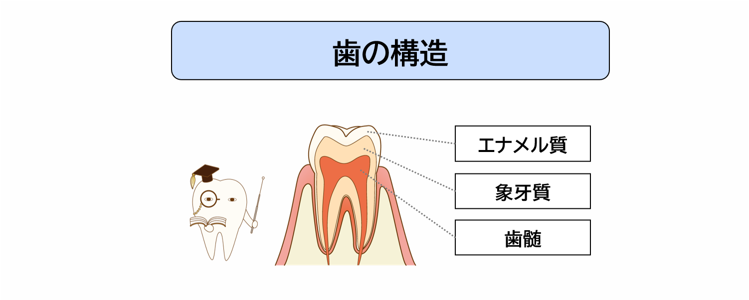 歯は表面からエナメル質、象牙質、歯髄の3つの組織から構成され、歯髄は象牙質の内側にある歯髄腔(しずいくう)という空洞に存在しています。
