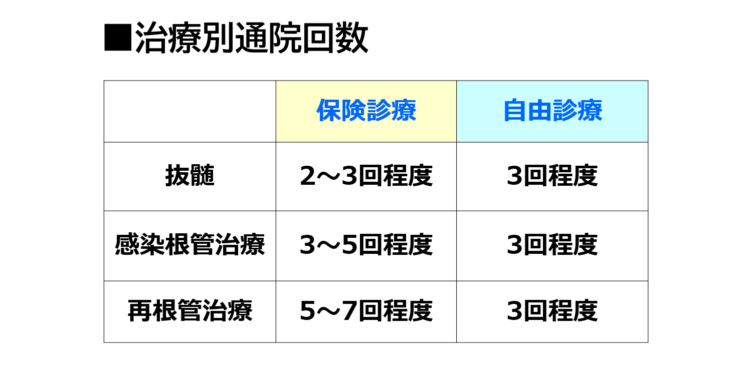 自由診療は先述した通り、マイクロスコープやNi-Tiファイルなど治療を行う環境が異なります。そのため、成功率の上昇とともに、治療回数の削減につながります。